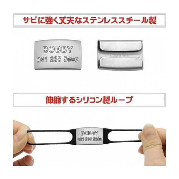 ステンレスちっ光迷子札・巻きつけ| 犬用迷子札(巻きつけるタイプ) ゴムをくるっと巻きつけるだけの簡単取り付け。 首輪(カラー)、胴輪(ハーネス)にゴムでくるっと巻きつけるだけの簡単取り付け。 ブラブラするのが気になる子におすすめです。 噛まれても曲がらない丈夫さと、負担のない軽さで人気。 プリントではなく、ステンレス板を溶かすこと 犬 迷子札 ステンレス製 サークル型 < 両面彫刻 > シンプル ドッグタグ ネームタグ 耐久性 名入れ 飼い主名 電話番 レビュー(5件) ペットグラフィックプロダクト